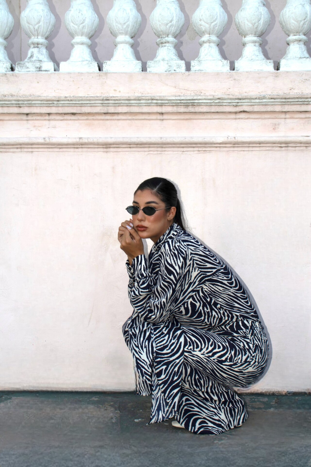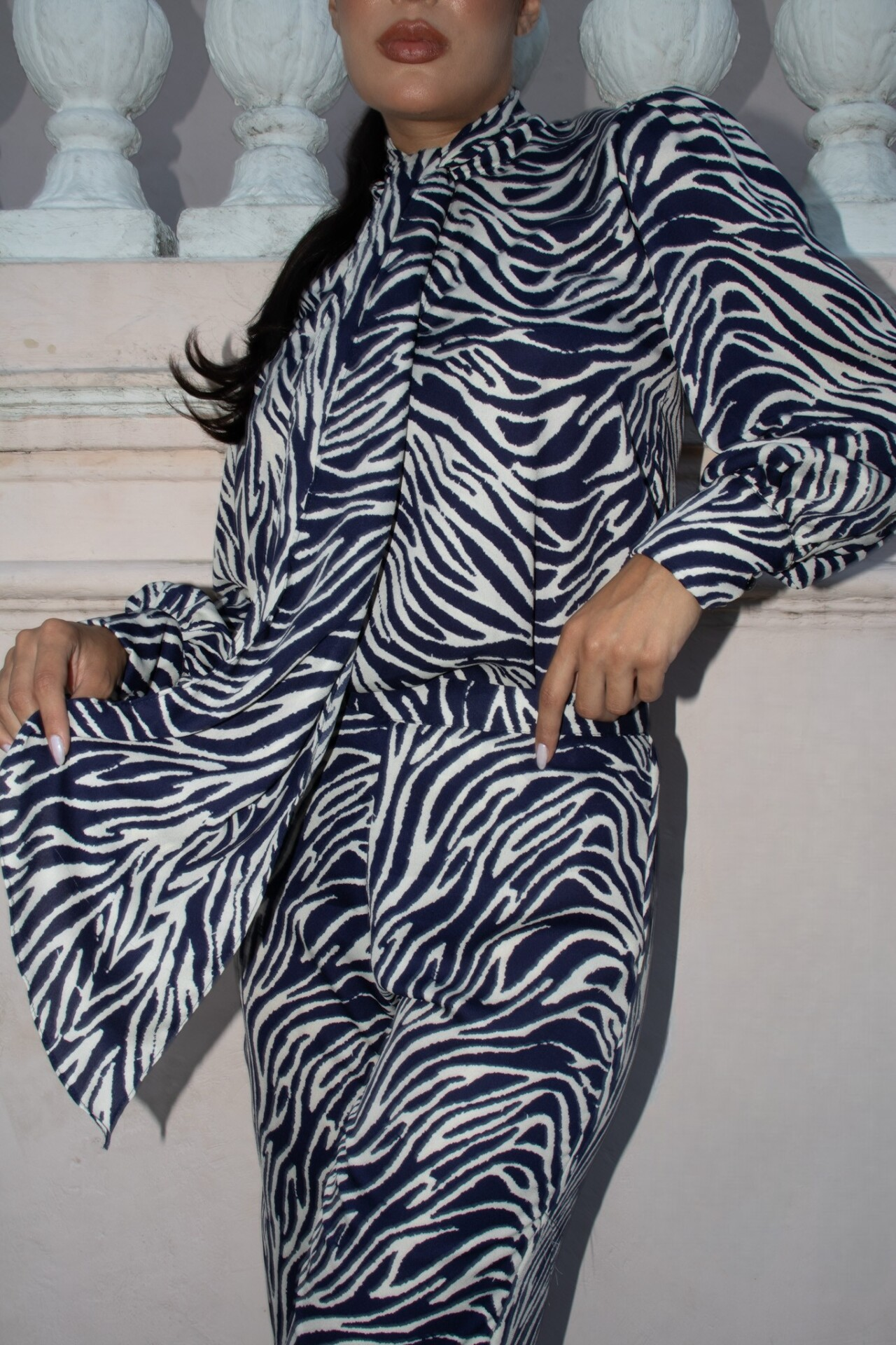 Entre linhas que ondulam como instinto e elegância, nasce uma peça que transita entre o selvagem e o refinado. A estampa de zebra, em contraste de azul marinho sobre fundo off, desenha movimento.