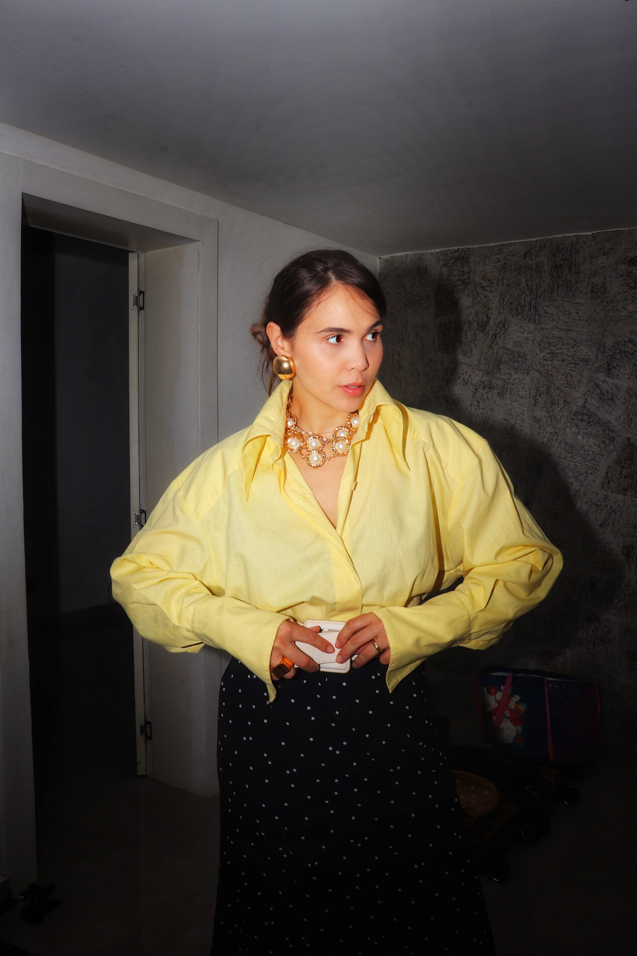 A gola de inspiração anos 70, com pontas longas e dramáticas, é o elemento central da peça, expressiva, quase escultural. Os punhos largos reforçam essa linguagem de presença e atitude, enquanto o recorte no ombro, característico das camisas vintage, desconstrói o padrão tradicional e cria uma silhueta mais esguia, alongada e potente.