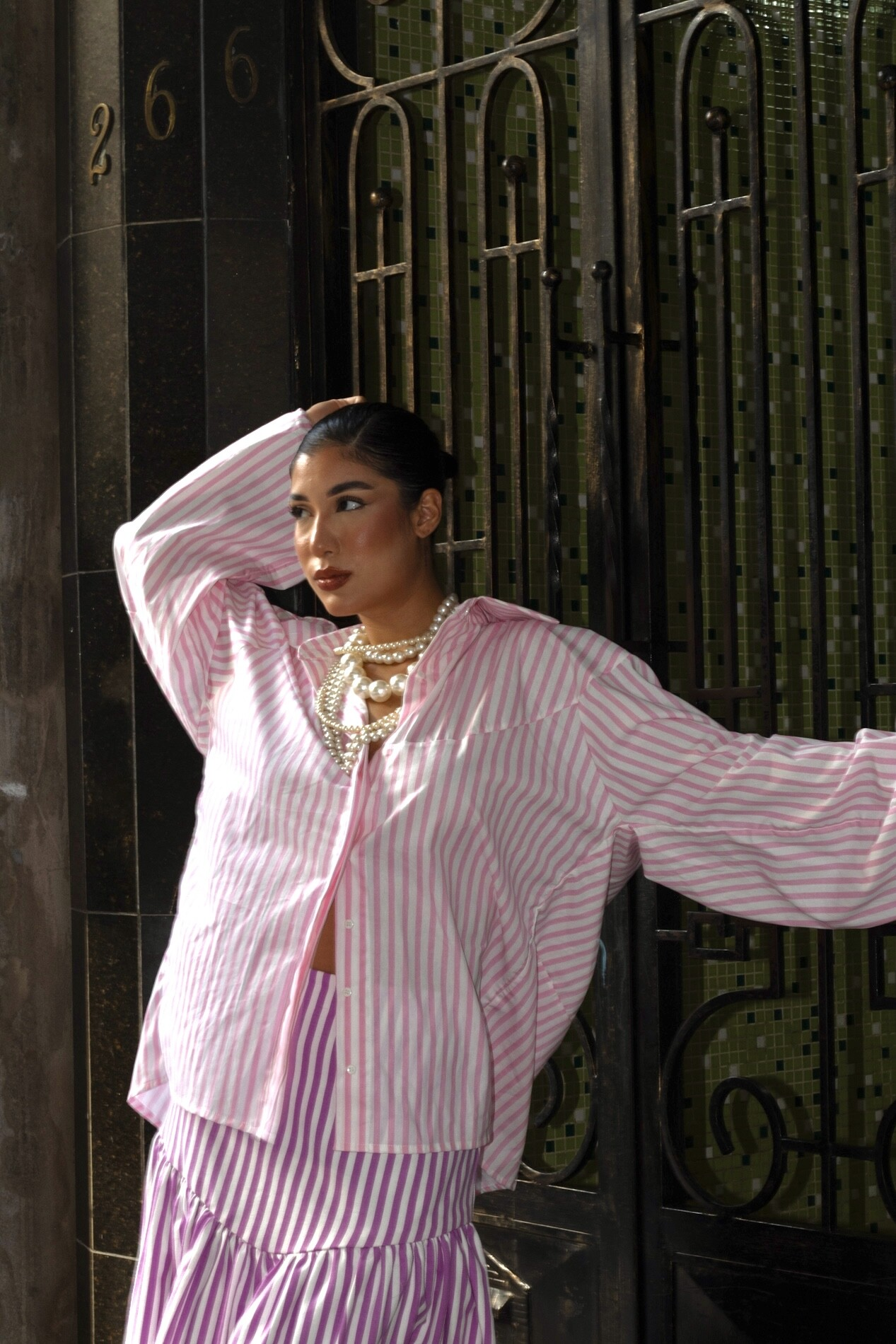 Esta camisa em tricoline listrado revela sua força nos detalhes: a vista invisível mantém a superfície limpa, enquanto a gola estrutura o olhar com sobriedade — criando um ritmo alinhado na parte superior da peça.