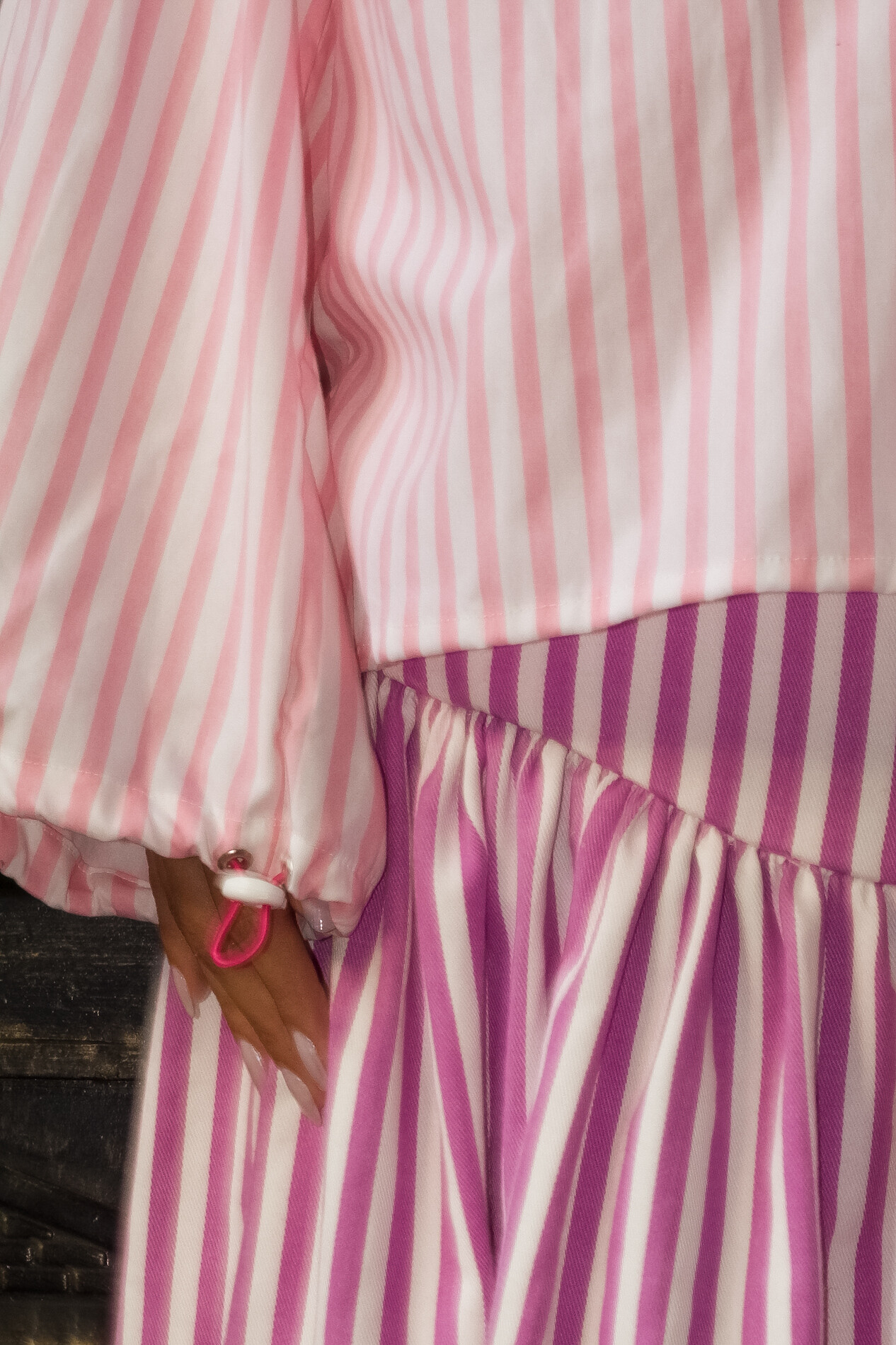 Os punhos amplos são o ponto alto da peça: abrem presença sem exagero, com regulagem por elástico que permite controlar o volume com intenção.