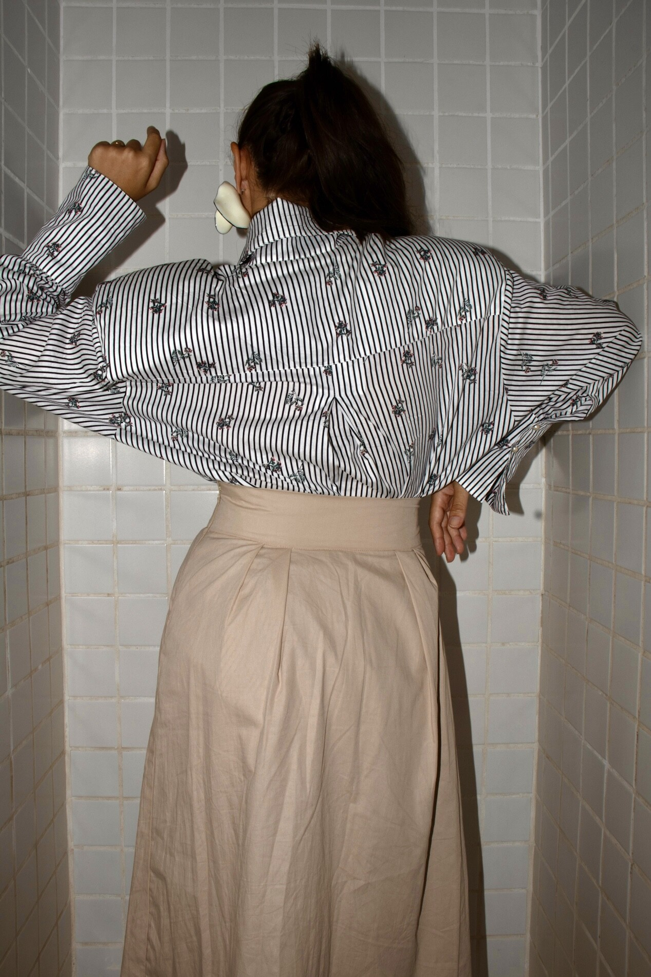Uma camisa sofisticada e marcante, que rompe com o óbvio. Confeccionada em tricoline listrado com estampa floral miúda de estética vintage com fundo branco, a peça traz botões com vista invisível, criando uma frente limpa que valoriza o desenho e a construção da modelagem.