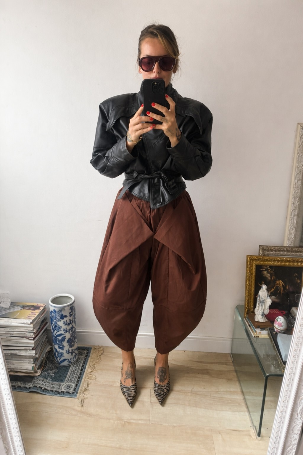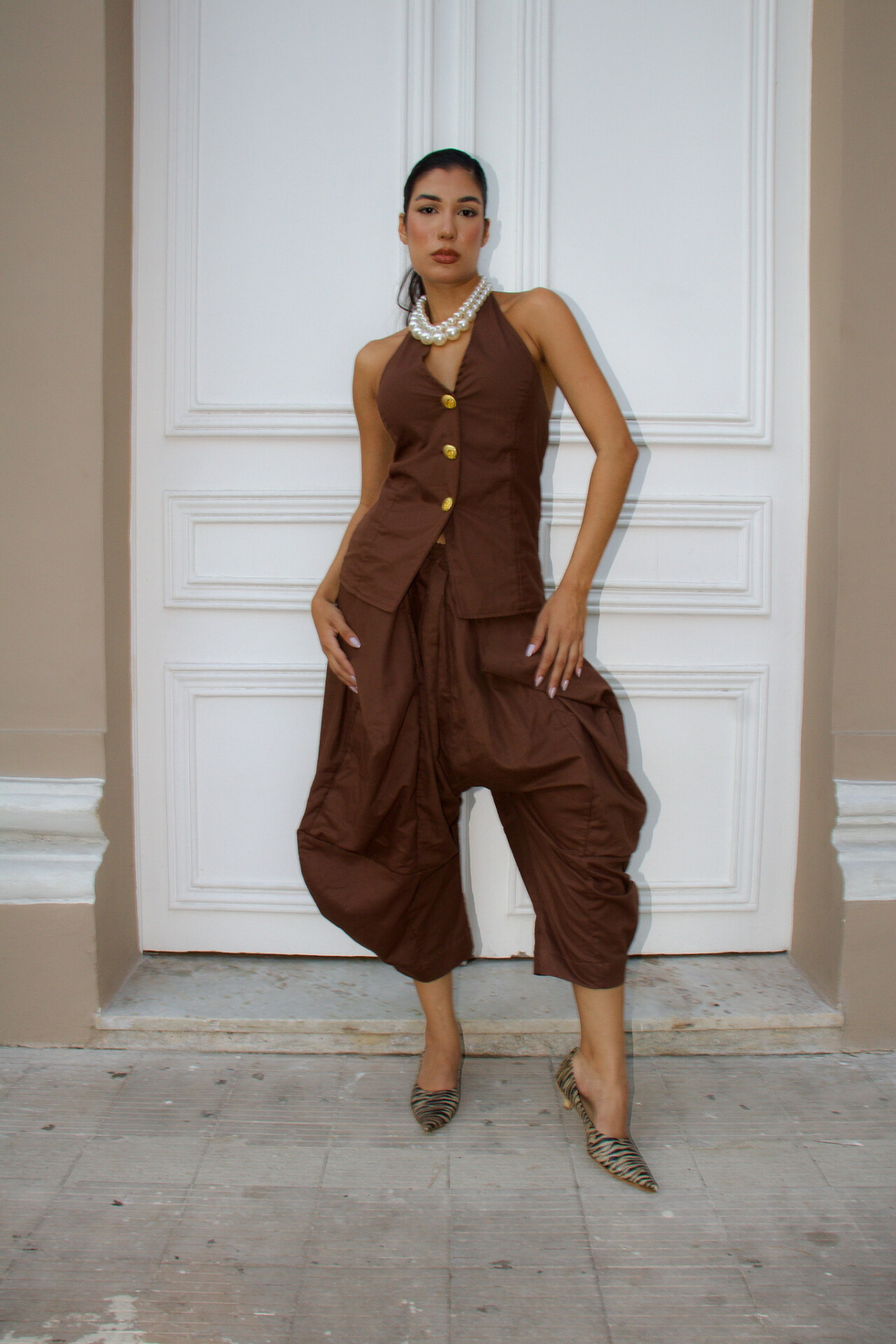 CALÇA ESTUDO 07 — VOLUME CONSTRUIDO POR RECORTES EM SARJA MARROM