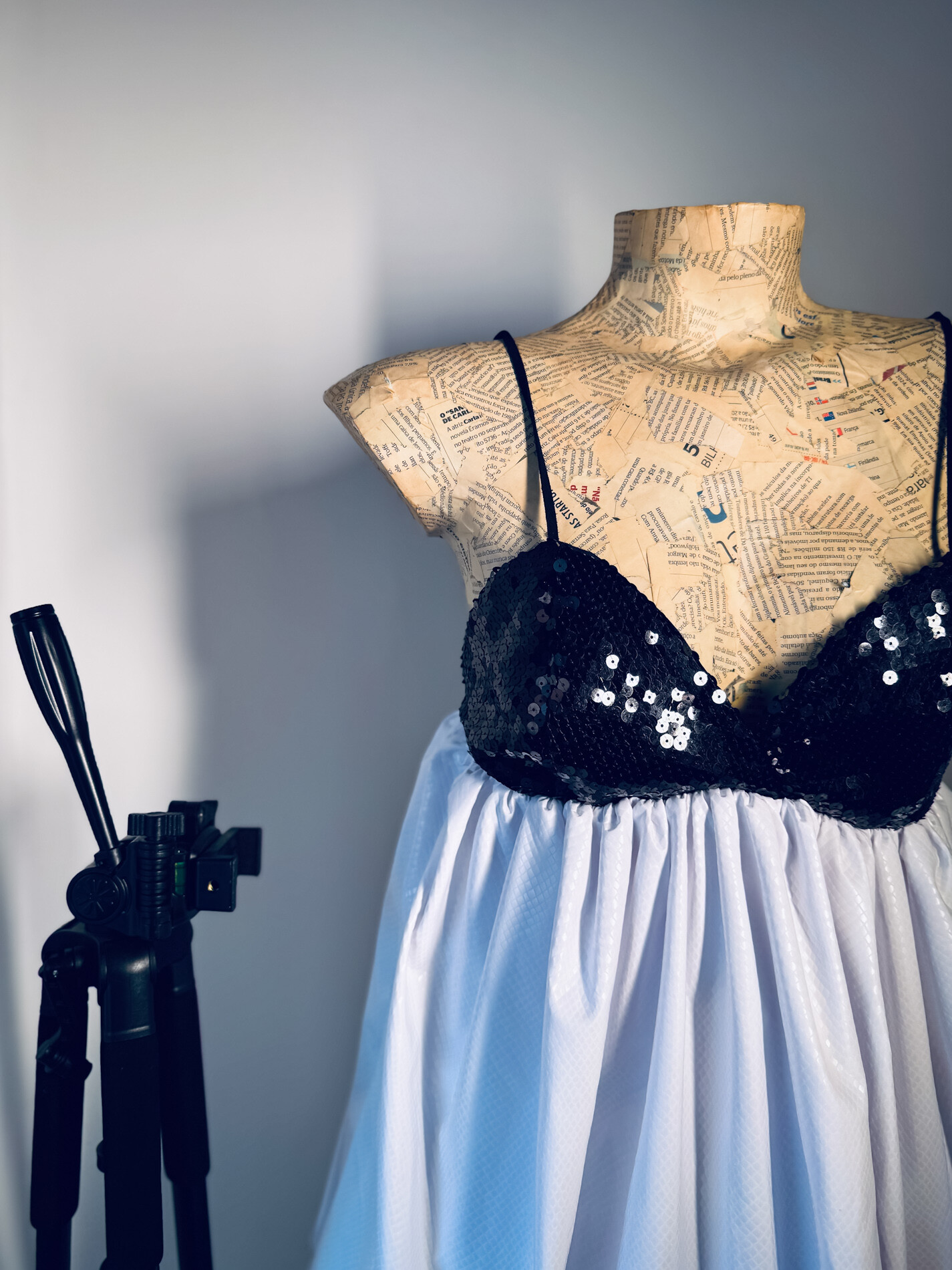 Com alças versáteis que podem ser amarradas no pescoço ou ajustadas nas costas através de engate, a peça permite diferentes leituras de silhueta. A saia interna é confortavelmente ajustada ao corpo, enquanto a camada externa em formato balonê cria volume e contraste, revelando uma arquitetura feminina e contemporânea.