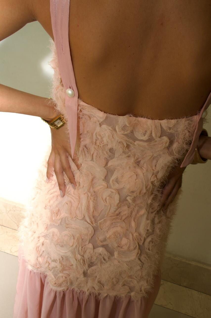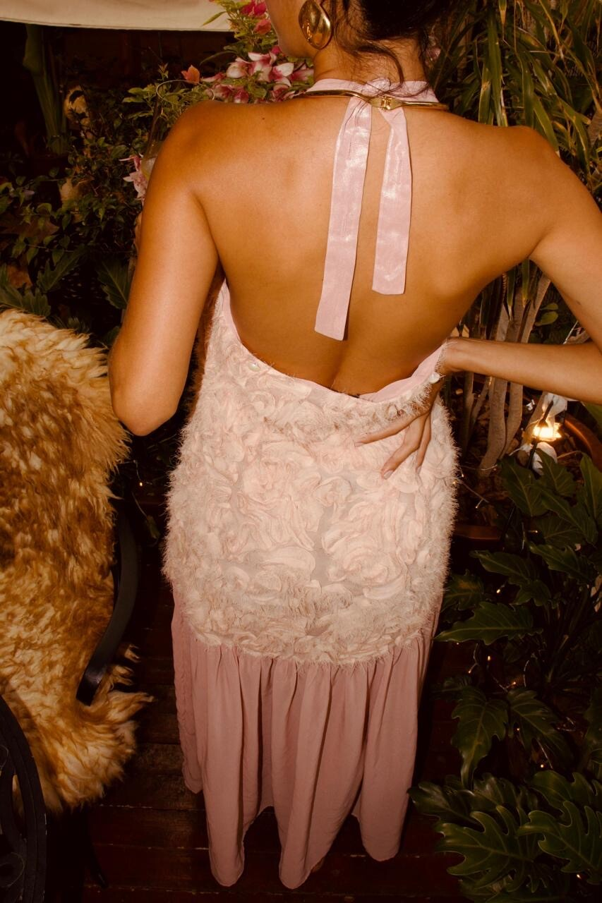 Vestido midi frente única em crepe de seda brocado, com caimento fluido e toque nobre. A silhueta valoriza o colo e alonga o corpo com leveza, enquanto a barra em organza fina cintilante cria um movimento etéreo, quase como um sussurro de luz a cada passo.